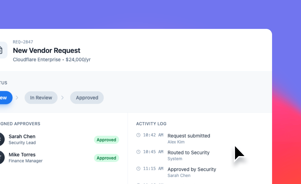 Standardize approvals with required inputs, defined reviewers, and audit-ready status tracking—so decisions don't stall in threads.